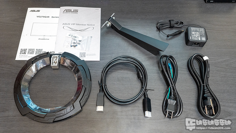 구성품을 살펴보면 모니터 받침대, 스탠드, 스탠드 고정나사, DP to DP 케이블, 110V 전원 케이블, 220V 전원 케이블, 19V 전원 아답터와 간단 사용 설명로 구성되어 있습니다.