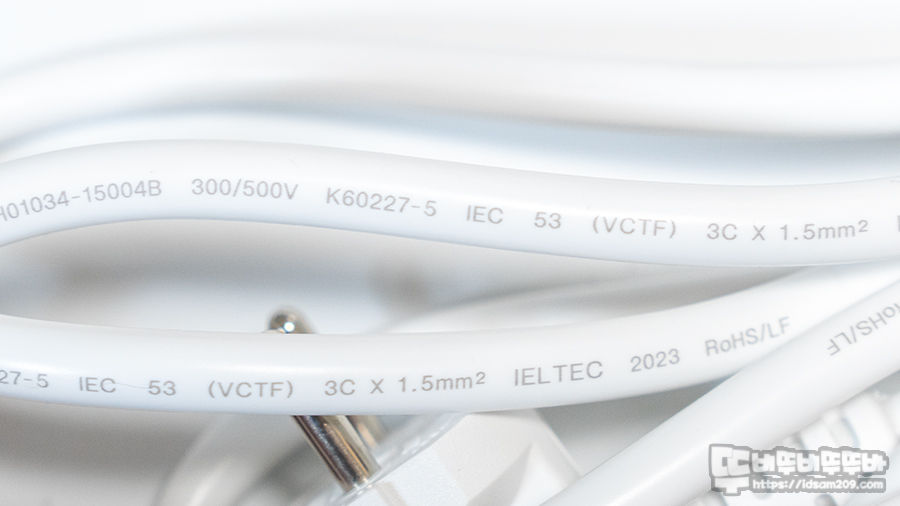 케이블의 인쇄 내용을 살펴보면 피복 속에 3개의 꼬인 전선이 사용된 3C, 께를 표현한 1.5mm2 그리고 RoHS 인증 내용을 확인할 수 있습니다.