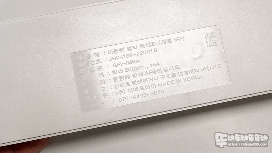 제품은 250V / 16A 출력은 최대 허용 전력 2,800W 이하 기기 연결이 가능하며 난연 PC와 특수합금강 소재로 제작된 멀티탭입니다.
