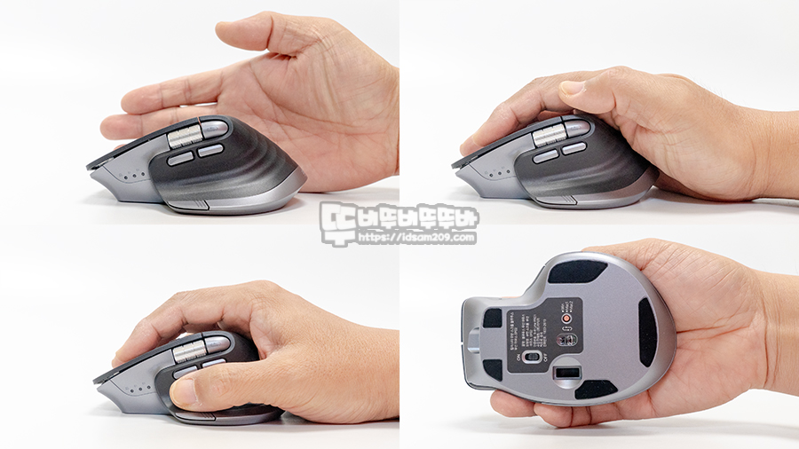 제품이 높게 솟은 디자인 특징 상 팜그립 시 손바닥이 감기는 느낌을 주며 손바닥이 마우스 뒷부분의 경사면에 걸쳐지면서 편안함을 주며 손바닥 끝부분이 바닥으로 지지하면서 손목 스냅으로 사용하게 됩니다.
