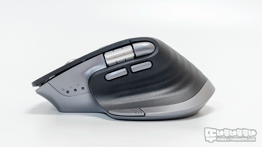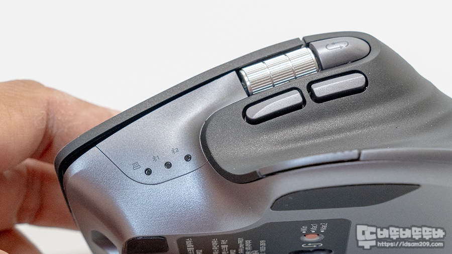 마우스 측면에는 RF무선, 블루투스 1, 블루투스 2 연결을 표현하는 LED 인디케이터를 확인할 수 있는데 LED 인디케이터는 무선 연결 표현과 DPI 단계 표현을 겸하며 연결된 LED를 1~5 단계 점멸로 현재 사용하는 DPI를 확인할 수 있습니다.