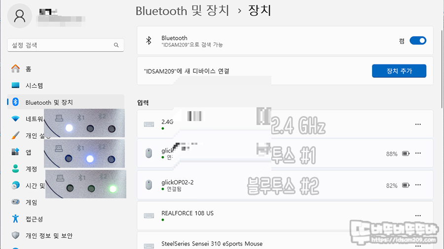 RF 2.4GHz 무선과 블루투스 1, 2 연결 시 기기 명칭을 다르게 표현하고 있으며 LED 인디케이터를 위치로 연결 방식의 구분이 가능하니 참고하세요.