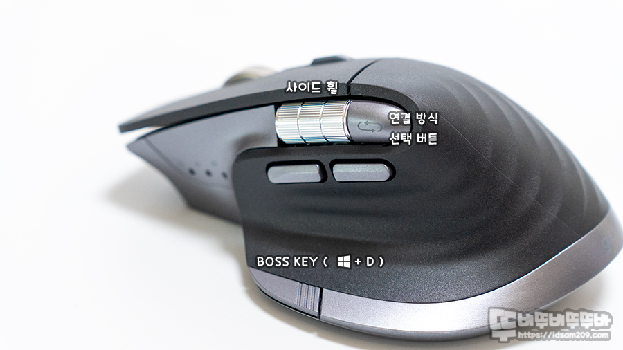 웹 페이지 또는 엑셀 화면을 가로 방향으로 움직이는 사이드 휠과 무선 연결 방식을 선택하는 버튼 그리고 사이드 버튼, 윈도우 키 + D를 이용하는 화면전환 기능이 내장된 BOSS Key를 확인할 수 있네요.
