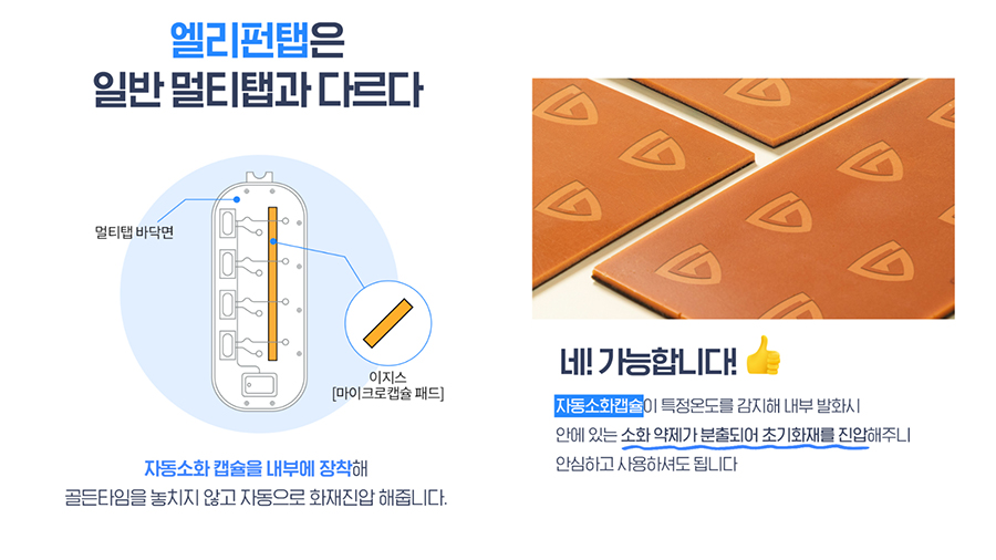 화재예방 기능이 내장된 엘리펀탭 자동소화 멀티탭의 기능을 소개하는 내용을 가져와봤습니다.