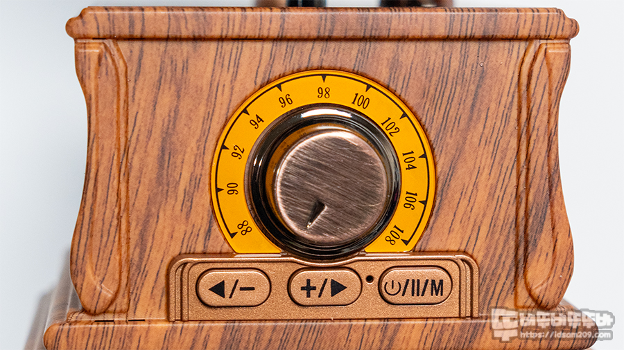 제품 상단에 나팔 혼, 축음기 모형 상단, 노브를 이용한 FM 주파수 조절, 3 버튼 컨트롤러 구성으로 전원 On/Off 및 입력 모드 변경, 트랙과 볼륨 조절이 가능합니다.