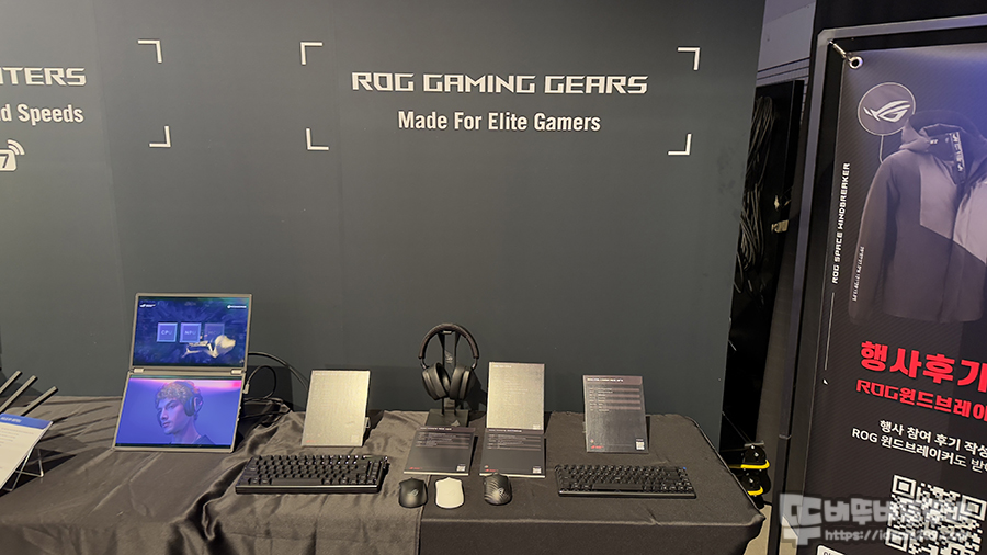 다른 전시 제품에 비해 약소해 보이는 게이밍 기어 전시물을 보면... 최근에 리뷰를 했던 ROG HARPE ACE MINI 마우스와 카본이 사용된 ROG HARPE ACE EXTREME 마우스와 ROG AZOTH EXTREME, ROG FALCHION ACE HFX 키보드 그리고 ROG DELTA S 헤드셋 등 가장 핫한 게이밍 기어를 전시하여 게이밍 공화국이라는 ROG 명성을 잘 보여주었습니다.