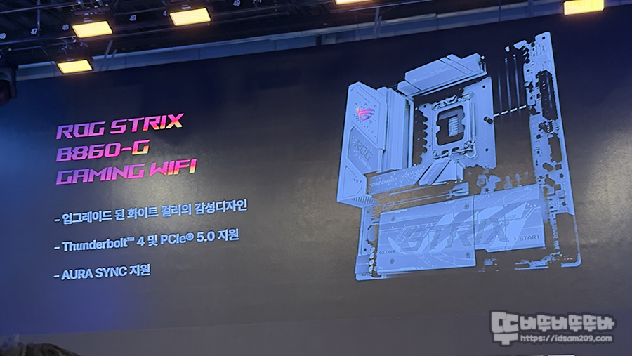 입구 양옆으로 배치된 세미나에 소개될 제품군을 살펴보았는데요. 먼저 B860 메인보드 시리즈는 왼쪽부터 프라임, ROG STRIX-F, STRIX-E 순으로 레이아웃을 보니 가격이 꽤 나갈 거 같은 느낌이 들었습니다.