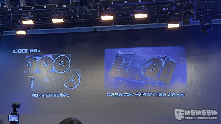 대망에 5080 라인업 소개에서 쿨링팬이 4개가 사용된 ROG Astral GeForce RT 5080 The Final Frontier 모델 설명을 너무 뽕에 취해서 설명하시는 바람에 너무 어렵게 설명해서 헷갈렸는데 전면 3개 흡기, 후면에 1개 배기 팬으로 총 4개의 쿨링팬을 구성하여 그래픽카드의 두께가 4 슬롯이 필요한 제품 출시된 게 특징인데요.