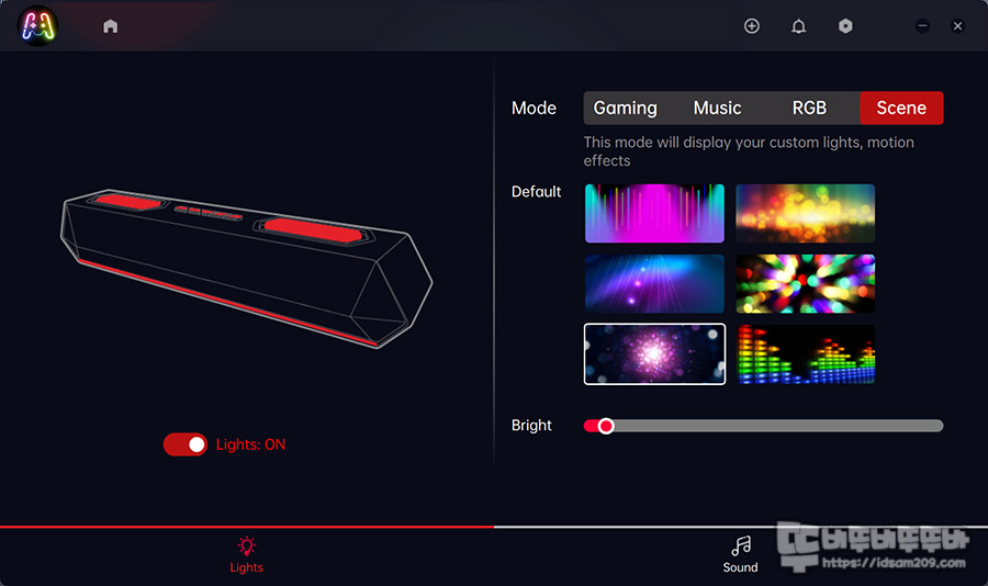 그 밖에 음악 소리에 반응하는 Music, RGB 고정 컬러를 선택할 수 있는 RGB, 움직이는 RGB 효과를 선택하는 Scene 모드를 선택할 수 있습니다.