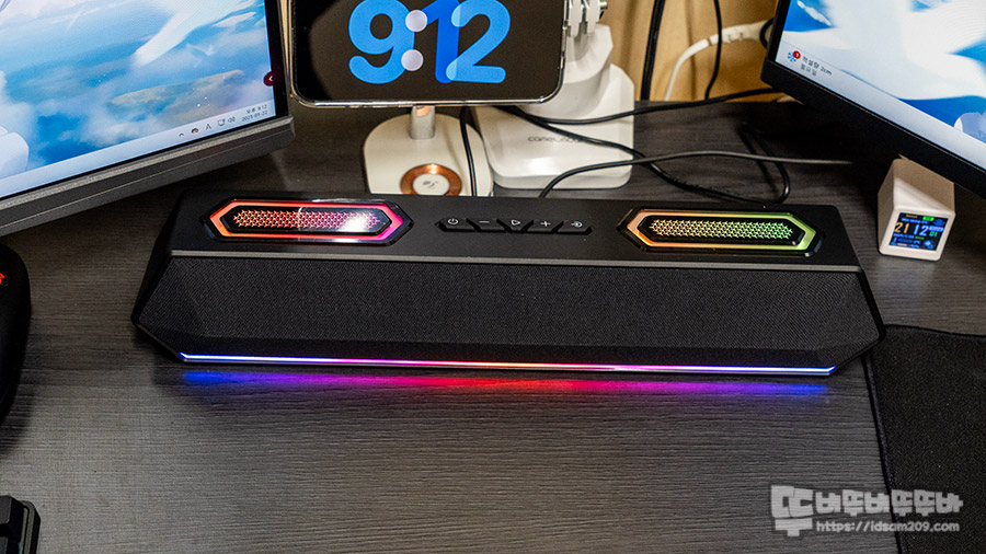 보통의 PC 사운드바는 스피커 유닛 2개를 사용하는 6W 내외의 제품이 주류를 이루고 있어 고 출력을 원하는 유저들은 조금 등한시하는 편인데 제닉스 TITAN SB9는 20W 출력의 우퍼와 5W 출력의 트위터를 2개씩 구성하고 하우징 내부의 울림을 패시브 라디에이터를 이용하는 구조로 최대 50W 출력과 패시브 라디에이터와 스피커 하단 LED 디퓨저 라인을 통해 다양한 LED 효과를 지원합니다.