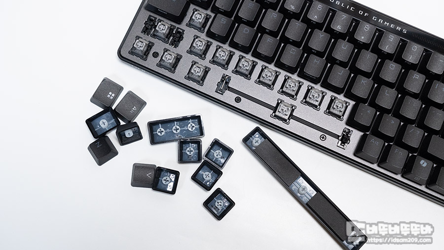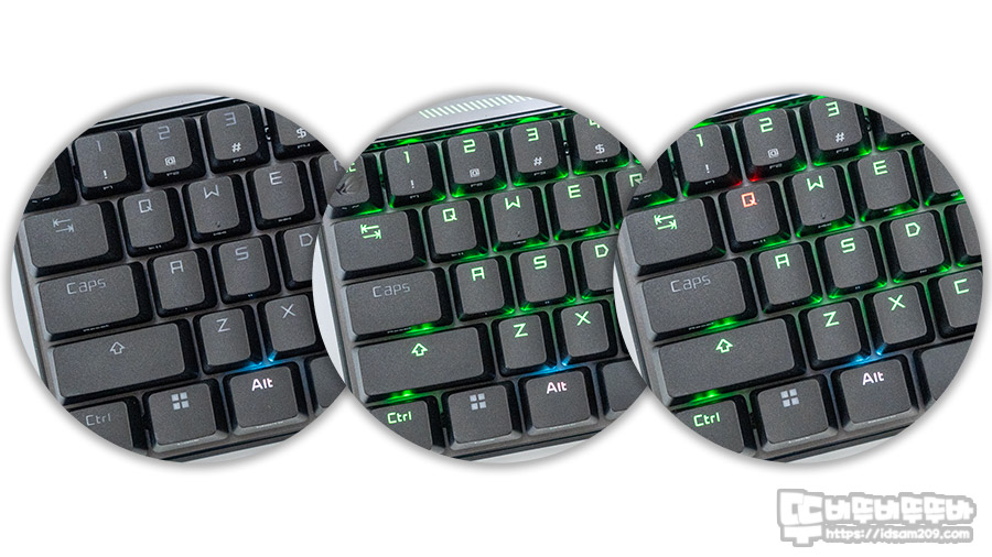 제품에 사용된 ROG HFX 자석축 스위치는 역방향 디자인이지만 PCB 기판에 SMD 타입으로 부착된 LED 라이팅이 스위치 내부를 관통하는 디퓨저를 통해 키캡으로 전달되기에 키캡 표면에 표현되는 LED 백라이트가 상당히 밝게 표현됩니다.