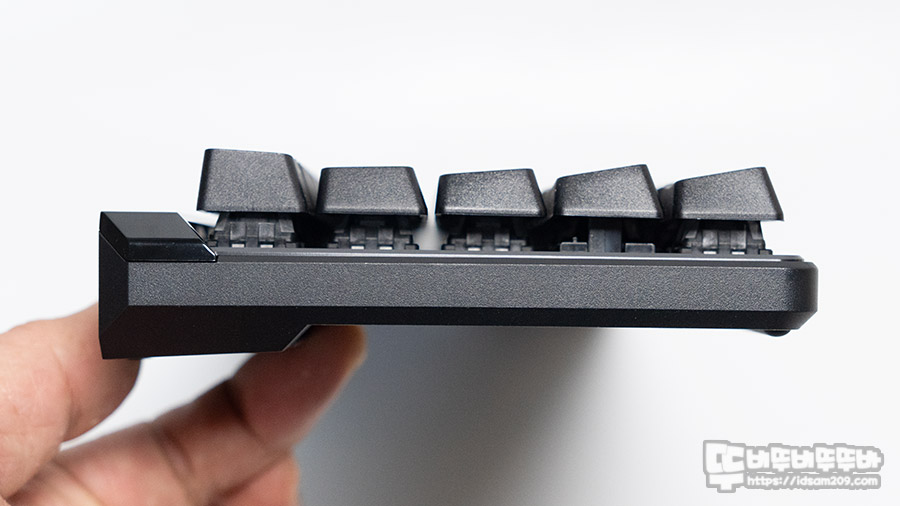 제품을 측면에서 보면 비키 타입 하우징에 스탭 스컬쳐 2 방식을 사용하고 있어 타이핑에 편리하며 2단 높이 조절 다리를 제공하고 있어 편안한 타이핑 각도를 만들어 사용이 가능합니다.