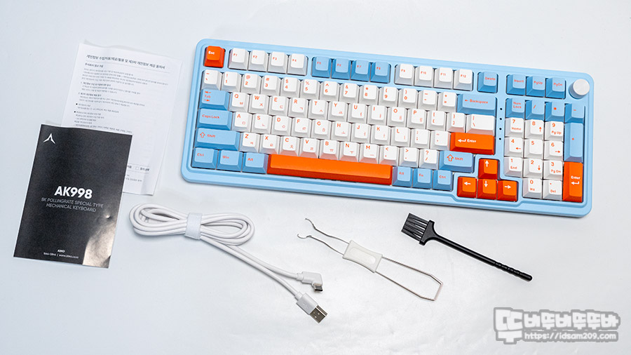 제품은 앱코 AK998 키보드 본체, USB-C to A 케이블, 스위치 & 키캡 리무버, 청소용 브러쉬, 사용 설명서로 구성되어 있습니다.