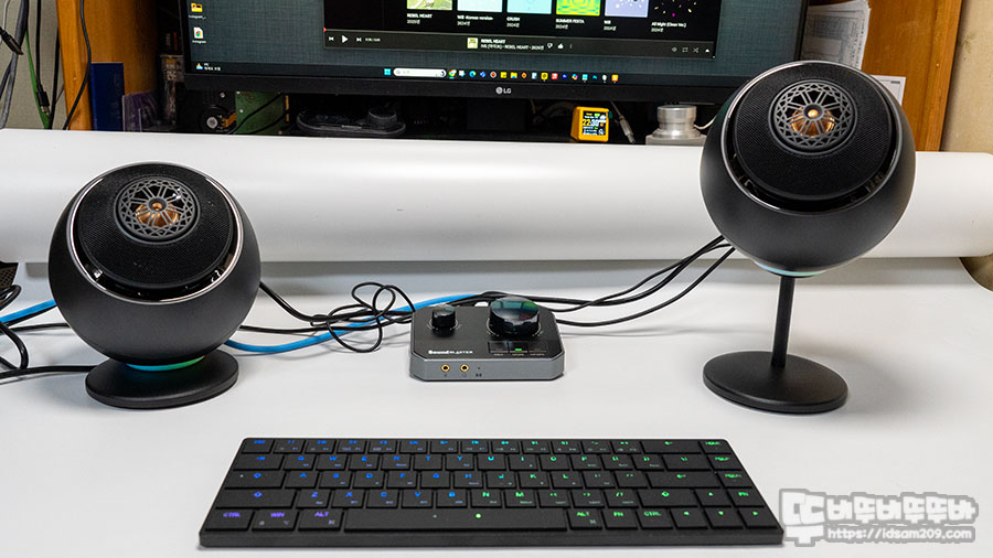 중저음 부분은 의자에 앉아서 소리를 들을 때 전면보다 퍼지는 형태로 전달되다 보니 스피커가 올려진 책상 상판이 부르르 떨리는 파워풀한 느낌을 경험할 수 있고요.