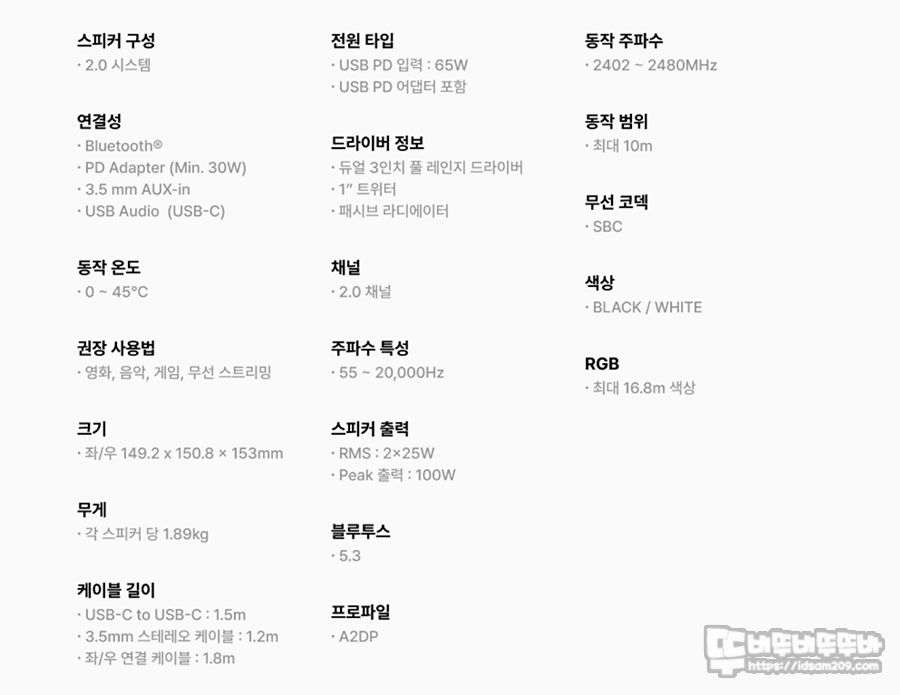유선 (USB-C, AUX in), 블루투스 V5.3(SBC 코덱) 연결 / 응답 주파수 : 55 ~ 20kHz / 출력 RMA 25W x2 (최대 100W 피크 출력) / USB-C PD 65W 전원 / 크기 149 X 150 X 153mm 등의 정보를 확인할 수 있습니다.