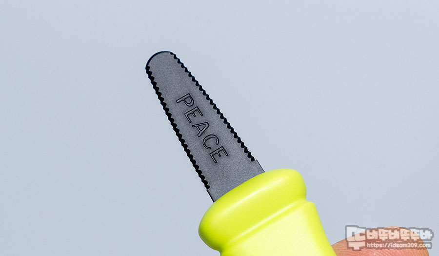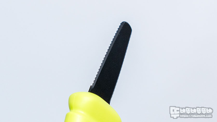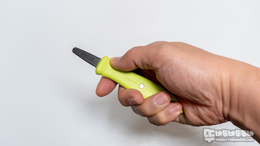 안전톱니날라고 표현하고 있는 검정색 톱니 부분은 보통 목공용 톱날, 철제 톱날과 같이 무언가 절단을 목적으로 하는 톱날보다는 톱날의 낙차가 빵을 써는 칼보다도 적어 손으로 만져도 쓸리는 느낌이 없이 안전함을 확인할 수 있습니다.