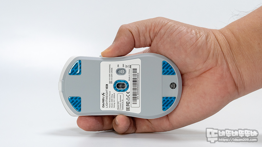 바닥면에는 RF 2.4GHz 무선만 지원하기에 단순한 전원 On/Off 스위치 구성과 마우스 뒤쪽에 넓은 피트를 부착할 수 있는 홈을 확인할 수 있네요.