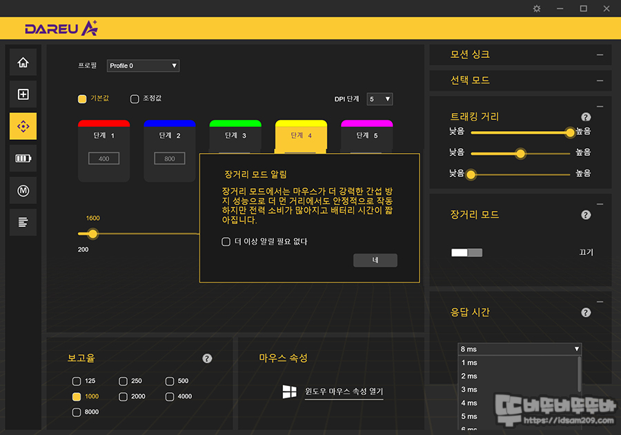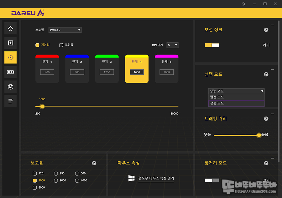 DPI 메뉴에서는 기본 5단계의 DPI를 지원하지만 하드웨어 적으로 DPI 버튼이 없기에 의미는 없지만 별도의 마우스 버튼 기능을 DPI 변경 버튼으로 변경하여 사용할 수 있으니 잘 선택하시면 좋을 거 같고요.