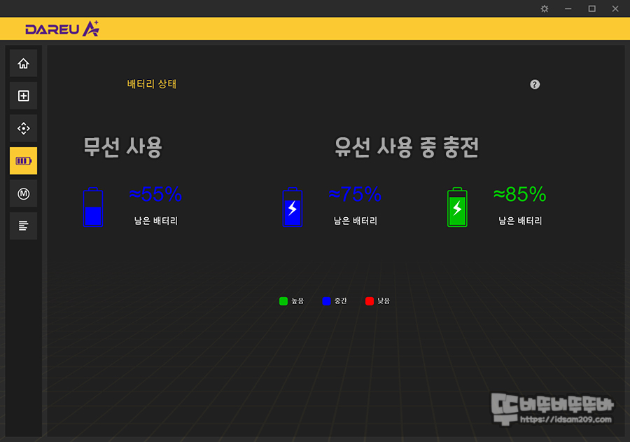 배터리 메뉴는 무선일 때는 잔량, 유선일 때는 충전 량을 표현하니 아래에 3가지 컬러로 구분되는 배터리 잔량을 참고하세요.