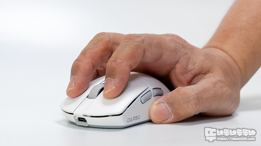 다얼유 A950 WING 8K 유무선 게이밍 마우스는 길이 119mm, 좌우폭 63mm, 높이 38mm로 손이 큰 필자가 사용하기에도 팜 그립 및 클로 그립으로 편안하게 사용할 수 있습니다.