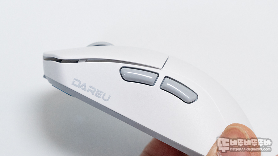절개형 버튼 디자인과 휠 다이얼, 사이드 버튼 등 기본적인 버튼 구조로 구성되어 있지만 DPI 버튼이 없어 즉각적인 DPI 설정은 불가능합니다.