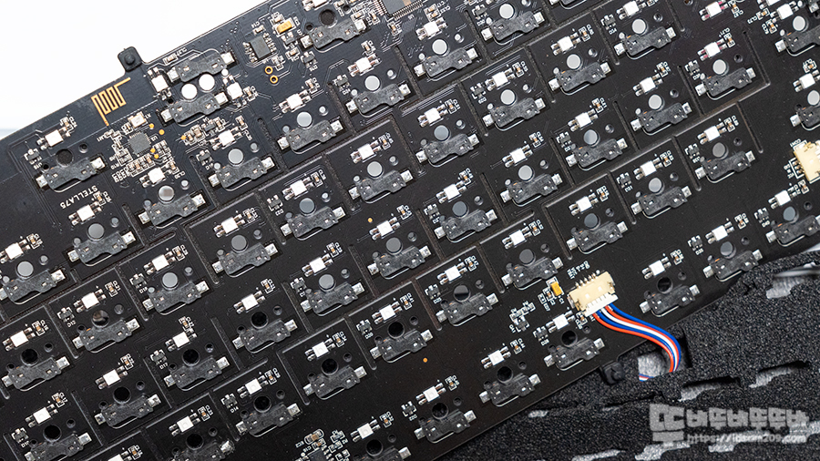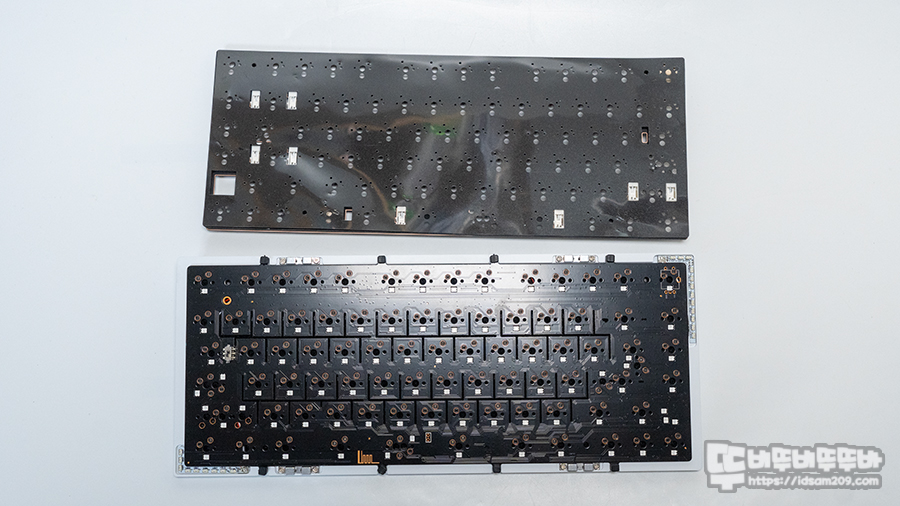 문자열에 플렉스컷이 적용된 핫스왑 기판 밑으로 소켓 모양으로 타공 된 흡음재와 매끈하고 얇은 흡음재가 사용되어 알루미늄 하판과의 공간을 메워주네요.