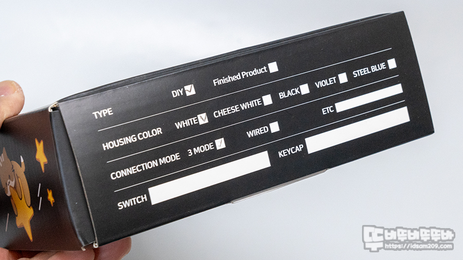 커버 분리한 패키지 사이드에는 제품의 형태를 확인할 수 있는 DIY, 화이트 하우징 컬러, 3 모드 등의 정보를 확인할 수 있으며 베어본 모델이기에 스위치와 키캡 정보를 생략되어 있으니 참고하시기 바랍니다.