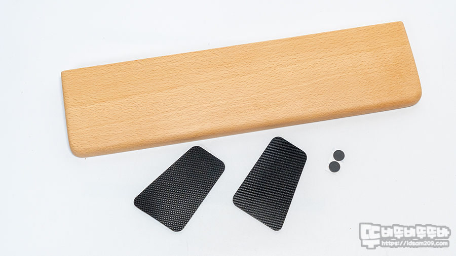 제품은 PT65 너도밤나무(Beech) 팜레스트에 미끄럼 방지 패드 한 쌍과 키보드와 맞닿는 부분에 스크래치를 방지하는 원형 패드로 2개로 구성되어 있습니다.