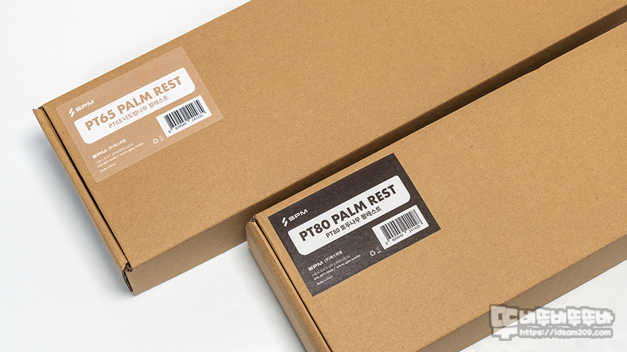 제품의 패키지는 팜레스트 사이즈에 맞게 길이가 다르며 무지 박스 패키지에 라벨 테이프를 부착하여 제품의 내용을 확인할 수 있습니다.