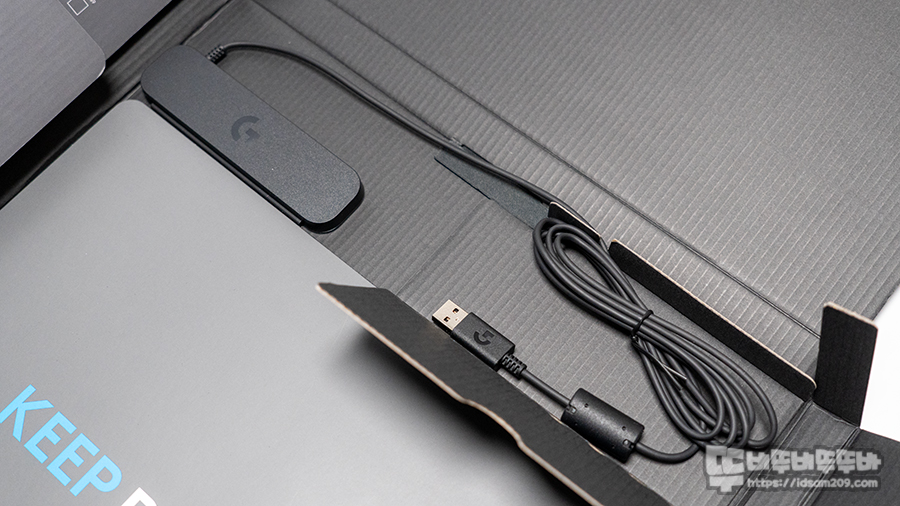 위쪽분의 오픈하면 1.8m의 USB 충전 케이블을 확인할 수 있으며 천 패드 표면을 보호하기 위해 종이 커버가 덮여있으니 커버를 벗겨내면 전체적인 패드 모습을 확인할 수 있고요.