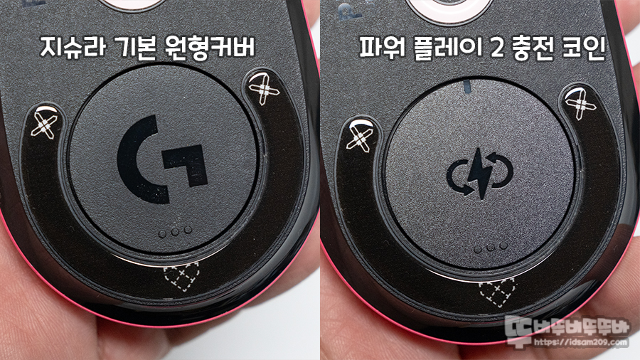 필자는 지슈라 1 핑크 모델을 구입하여 사용하고 있는데 기본 원형 커버와 비교를 해보면 파워플레이2의 전용 충전 코인의 번개 표시가 누가 봐도 구분이 될 정도이며 충전 코인이 살짝 무게 나가는 편입니다.