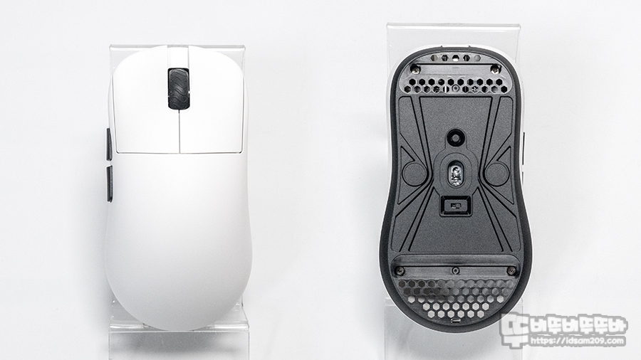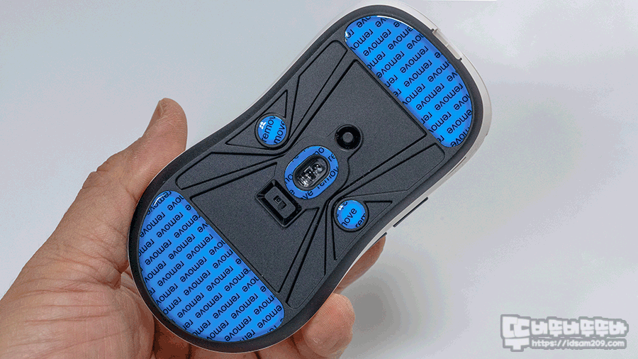 대칭형 디자인으로 출시된 람주 잉카 무선 게이밍 마우스는 화이트 컬러 사출에 UV코팅으로 매끄러운 느낌을 주며 바닥면에는 센서 위로는 DPI 버튼 아래쪽에 위치한 전원 스위치가 심플하고 직관적입니다.