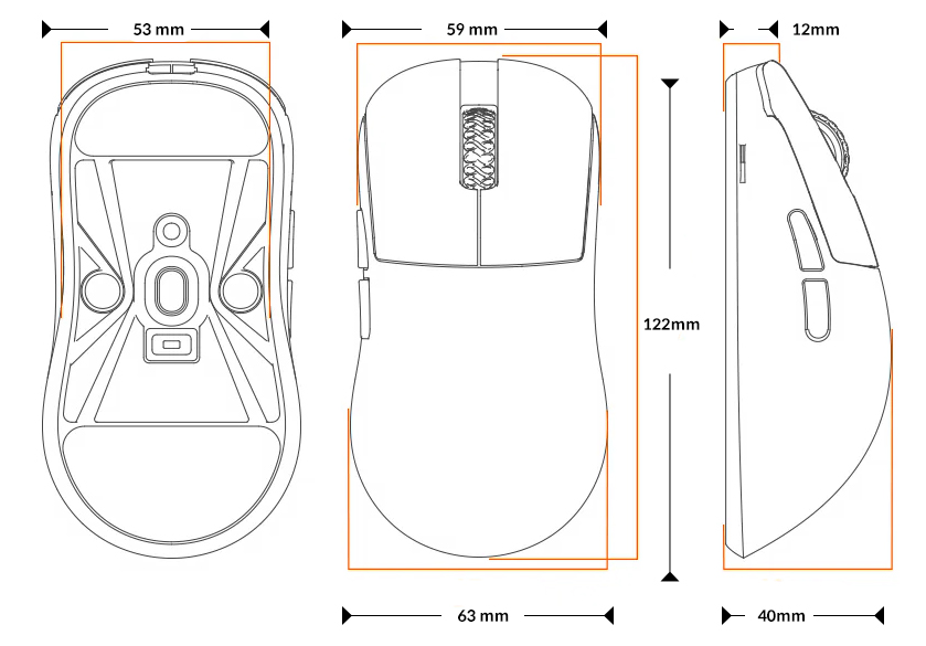 먼저 마우스 122mm 길이의 람주 잉카는 마우스 등 부분이 뒤쪽으로 솟아오른 40mm 높이에 앞쪽부터 59 / 53 / 63mm 폭으로 디자인되어 슬림한 측면과 두툼하게 디자인된 후면부가 안정감 있는 그립을 제공하는데요.