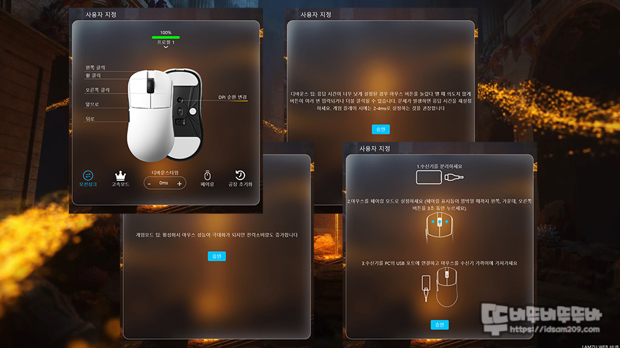 중간의 사용자 지정 메뉴는 버튼 기능, 모션 싱크, 고속모드, 페어링, 공장 초기화 기능을 제공하며 마지막 성능 메뉴에서는 DPI, 폴링 레이트, LOD, 절전모드 시간 설정을 지원합니다.
