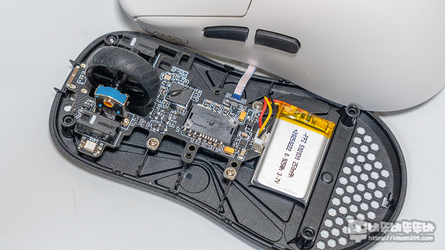제품을 분해해 내부를 살펴보면, 무게를 줄이기 위한 다양한 노력이 눈에 띄는데 컴팩트하게 설계된 PCB 레이아웃, 250mA 용량의 리튬 폴리머 배터리, 피트가 부착되는 부분의 타공처리 그리고 상판 내부의 빈 공간과 절개형 버튼부의 연결 부위 면적까지 다이어트하여 최대한의 가벼움을 추구한 모습이 인상적이었습니다.