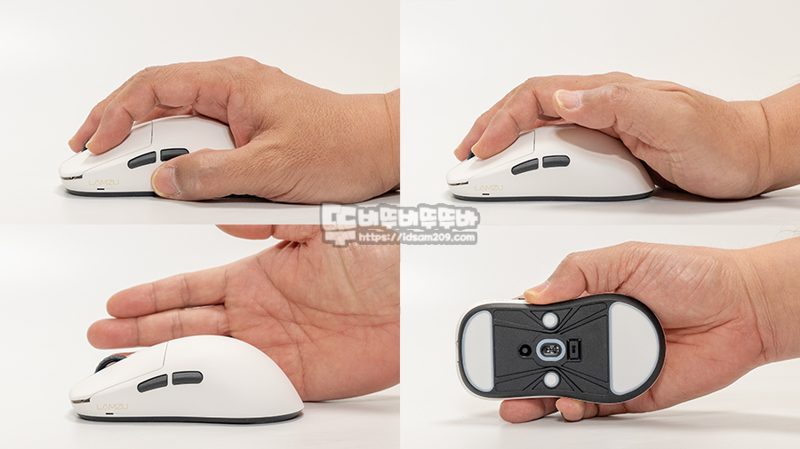마우스 등 부분의 중심이 뒤쪽으로 치우쳐 있어 마우스 그립 시 손바닥이 마우스 등 부분에 걸쳐지는 형태로 자연스럽게 클로 그립으로 사용하게 됩니다.
