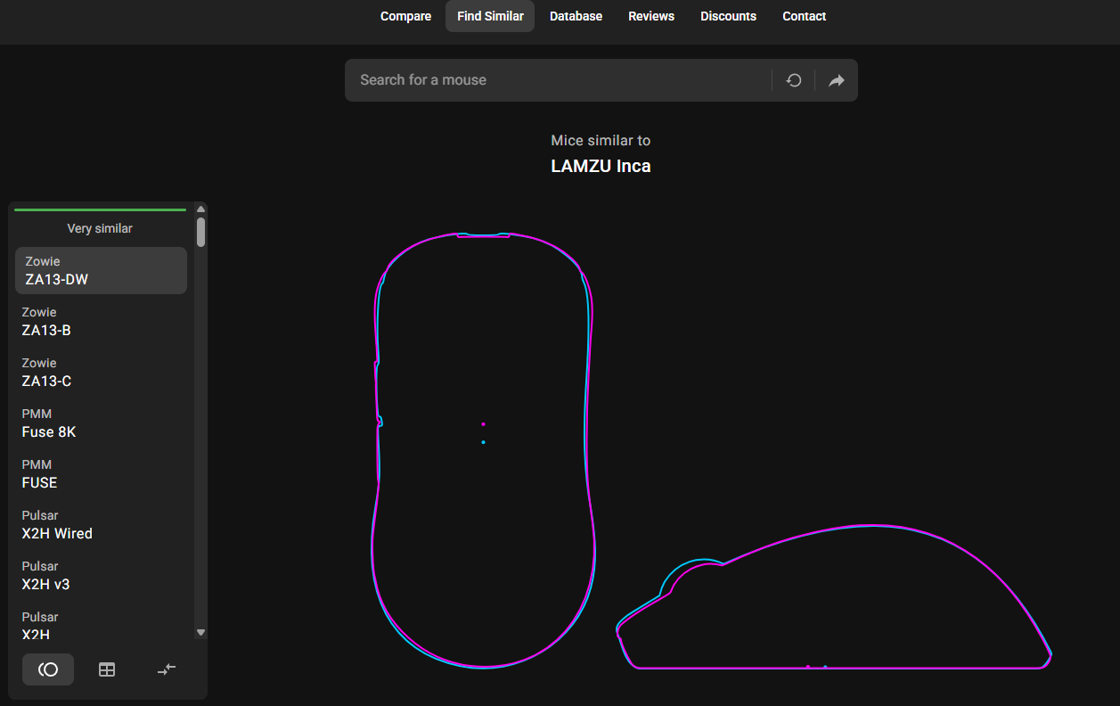 마우스 쉘 디자인을 검색해 주는 eloshapes 사이트에서 람주 잉카(스카이블루 컬러)를 입력해 보면 벤큐 조위기어 ZA-13(퍼플 컬러) 시리즈와 쉘 디자인이 똑같은 것을 확인할 수 있는데 그립감이나 버튼의 클릭부 높이가 동일하여 비슷한 느낌을 주는데 많은 분들이 이야기하시듯 상대적으로 저렴한 가격, 8K 지원 가벼운 무게 등이 람주 잉카의 강점이 될 거 같네요.