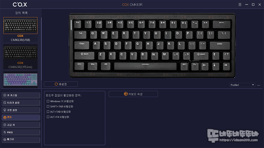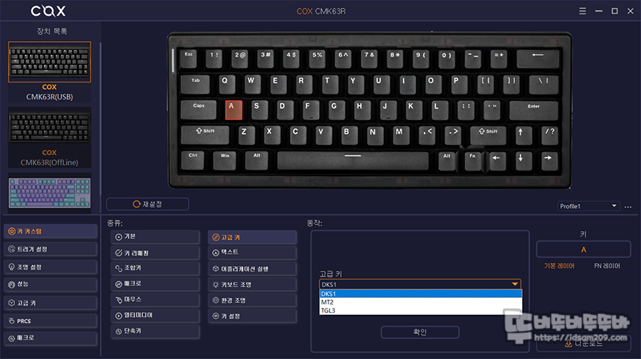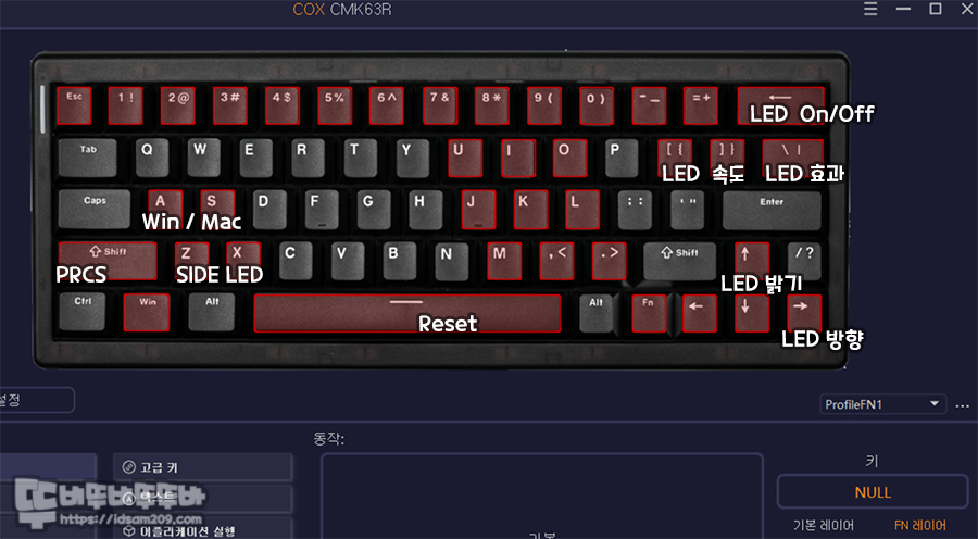 스페이스바 오른쪽에 Alt, Fn 키로 구성된 제품의 경우 오른쪽 Ctrl 키가 없기에 Fn + 오른쪽 Alt 키 조합으로 사용하게 기본으로 설정해 주면 좋은 몇몇 브랜드를 제외하고는 대부분 설정이 없는 상태로 판매를 하고 있는데 COX CMK63R 아마겟돈 에디션 또한 이런 설정이 없이 판매되고 있어 키보드에 전문 지식이 없는 분들은 많이 난감하게 됩니다.