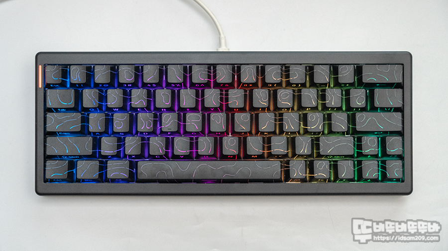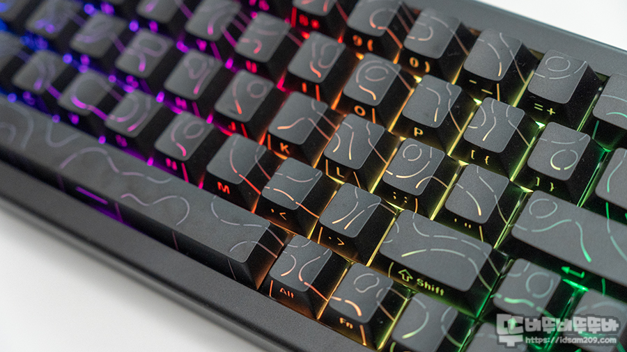 보강판에 부착되는 체리방식의 스빌라이저 또한 안정적인 키보드 빌드의 한 축을 담당하고 있으며 체리 프로파일의 PBT 이중사출 키캡은 꽤 두툼한 편이며 3D 키캡이라 언급한 것과 같이 측각 부분도 레이저 각인이 아니 사출로 제작되어 정방향 키캡의 LED 라이팅을 잘 표현합니다.