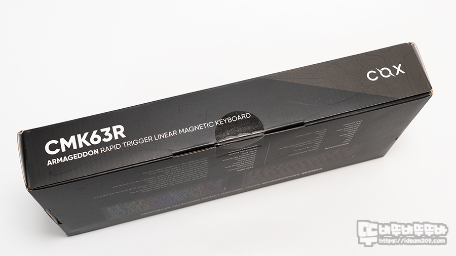 패키지는 레드 컬러 백라이트의 등고선 이미지가 꽤 인적으로 표현되어 있는데 CMK63R 모델명과 아마겟돈 에디션 강조, HAIMU 저소음 자석축, PBT 이중사출 키캡, 디폴트 8K 폴링 레이트 등의 정보로 제품의 특징을 어느 정도 확인할 수 있습니다.