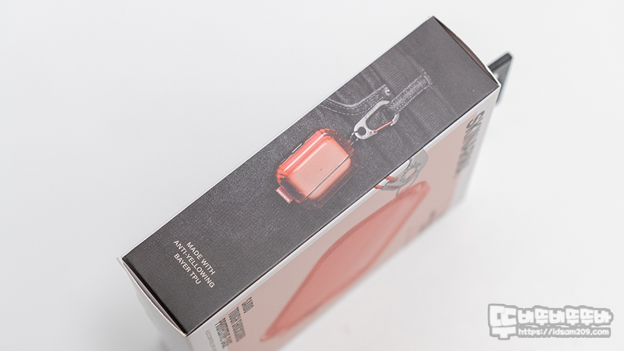 사이도 에어팟 프로 2 케이스는 카라비너, 열쇠고리 링, 케이스 상부, 하부로 구성되어 있으며 하우징 재질은 Bayer사의 TPU 열가소성 폴리우레탄(TPU)으로 제작되었습니다.