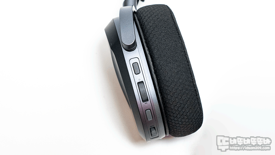 왼쪽 부분에 위치한 컨트롤 버튼 구조를 살펴보면 아래쪽에 USB-C 충전 및 유선 단자, 앞쪽에는 삼각형 몰딩으로 디자인된 붐 마이크 단자 뒤쪽으로 넘어오면서 2.4GHz/Off(유선사용)/블루투스 Tri-Mode 입력을 선택하는 셀렉트 스위치, 원버튼 블루투스 컨롤 버튼, 볼륨 다이얼, 마이크 On/Off 스위치 구성을 확인할 수 있고요.