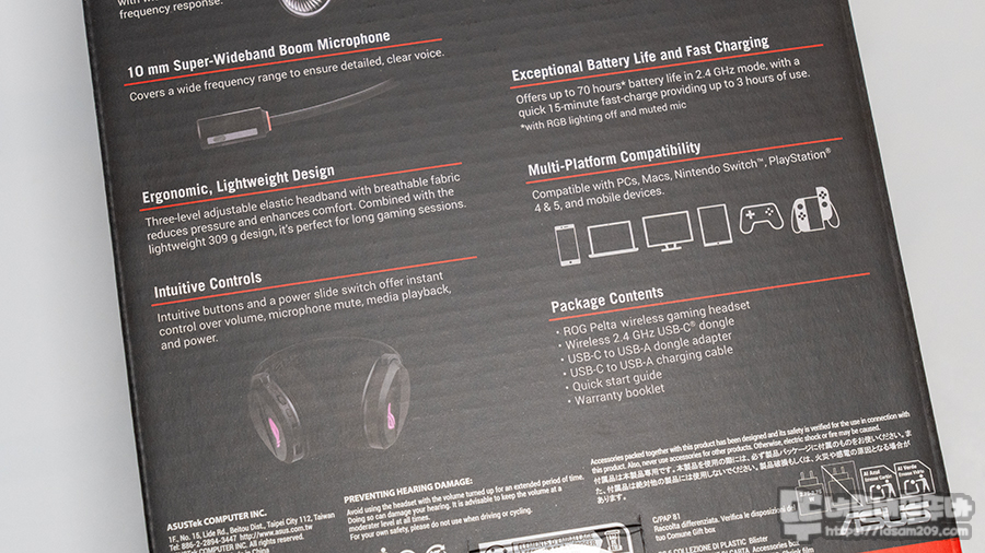 패키지에는 제품의 이미지와 모델명 ROG PELTA 그리고 ROG의 최고 수준의 무선 솔루션 SpeedNova 기술, 블루투스, RF 2.4GHz, PS5 지원 등을 확인할 수 있고요.