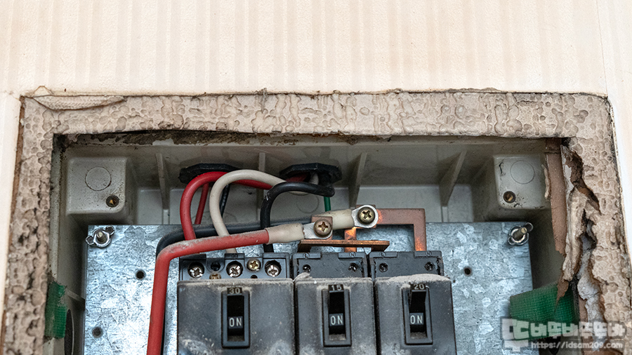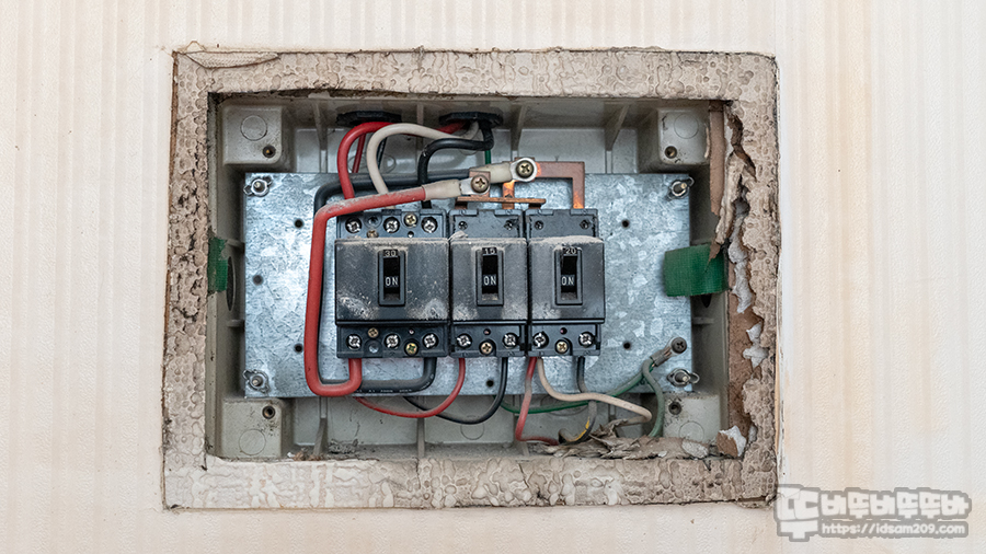 두꺼비집 커버를 열었을 때 스위치만 보이는 깔끔한 구조를 보니 어쩔 수 없이 커버를 고정하고 있는 나사를 풀고 내부를 살펴봐야 했습니다.