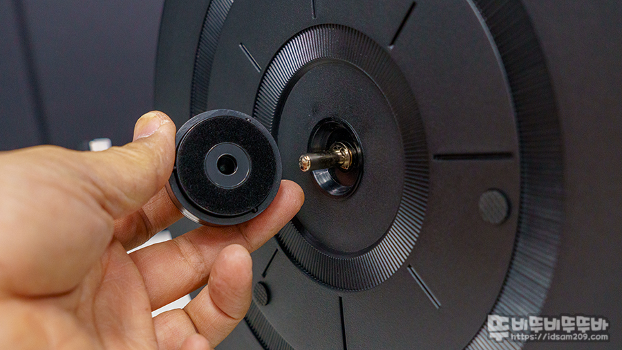 일반적인 테이블형 턴테이블은 중력에 의해 안정적인 재생이 가능하지만, 버티컬 방식에서는 회전 중에 LP가 살짝 들릴 수 있어 재생 중에 안정감 있는 회전을 위해 자석으로 눌러주는 전용 어댑터가 기본 제공됩니다.