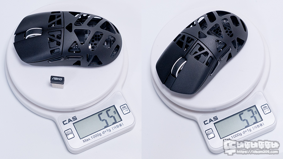 제품 스펙의 48g 무게를 확인하기 위해 1g 단위로 측정 가능한 디지털 저울로 무게를 측정해 보니 무선 동글 포함 55g, 무선 동글 제외 시 53g으로 48g 무게와는 차이가 엄청나는 편입니다.
