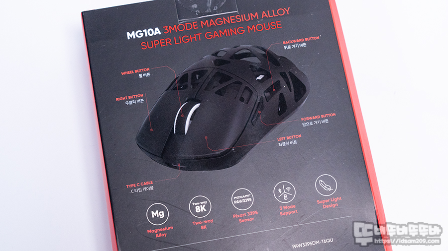 앱코 MG10A 패키지에는 제품의 이미지와 모델명 그리고 마그네슘 합금, 3 모드 연결, 가벼운 무게, Pixart PAW3395 센서가 사용된 게이밍 마우스 임을 강조하고 있습니다.