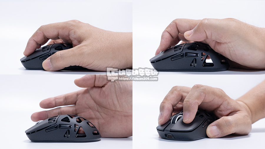 마우스의 앞뒤 길이가 113mm이기에 상당히 작은 느낌으로 다가오는데 62mm 폭과 40mm 높이가 약간의 그립감을 도와주는데 전체적으로 미니 타입이기에 팜, 클로, 핑거 그립이 가능하고요.