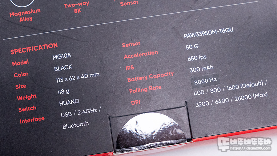 113mm/62mm/40mm 크기와 48g 무게, 후아노 스위치, 유무선 블루투스 3모드 연결 지원 / 픽셀아트 3395 센서 - 최대 26,000 dpi / 8K / 300mAh 배터리 내장 / 3시간 충전 - 최대 100시간 사용 / 상판과 버튼 부 마그네슘 합금 적용 등의 정보를 확인할 수 있습니다.