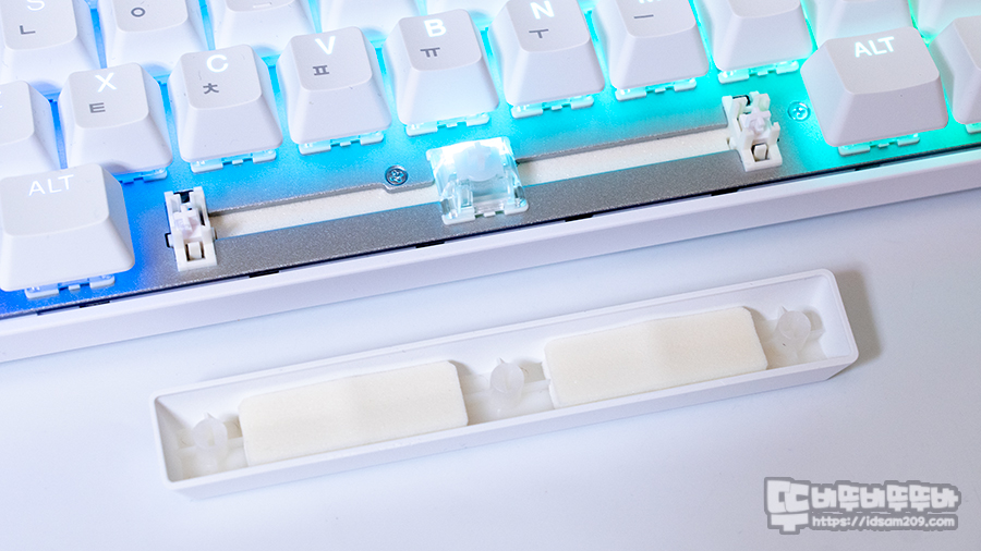 스페이스 바에 들어간 스태빌라이저 구조를 보면 보강판 아래나 키캡 안쪽까지 흡음재를 꼼꼼하게 넣어 소음을 줄이기 위해 꽤 신경 쓴 걸 알 수 있고요.
